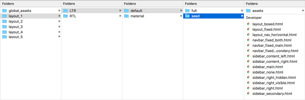 Each layout contains a set of blank pages called "Starter kit" (or Seed project). This kit may be very useful for developers who will work on integration. Each page includes a basic markup - navbar, sidebar, content area and a footer. The functionality is limited by default to necessary elements only - jquery and bootstrap JS libraries; bootstrap, layout, pages, helpers and core CSS files compiled from LESS.