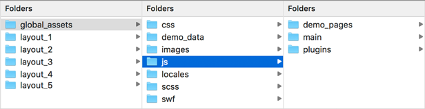 Global assets folder contains CSS files that are shared across layouts - font files and styles, 3rd party extensions etc. Each layout also contains assets folder with layout specific CSS files. icons/ folder includes 3 icon sets, each set is inside separate folder. extras/ folder includes extra css files, such as animate.css library. Main structure:
