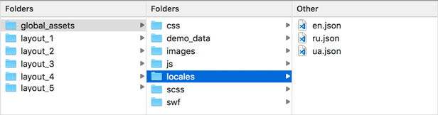 Assets folder contains 7 sub folders, each folder includes a bunch of subfolders with related files. /demo_data and /locales are used for demo purposes only, they contain JSON/TSV/CSV files with demo data for multi level tree, maps, typeahead, file uploaders, wizard, charts and internationalization. Main asset subfolders are: